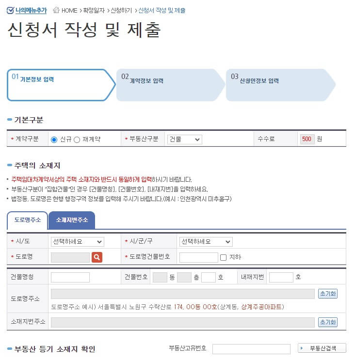 ▼ 드디어 확정일자 신청서 작성 폼이 나옵니다. 오류가 완벽히 해결되었습니다.